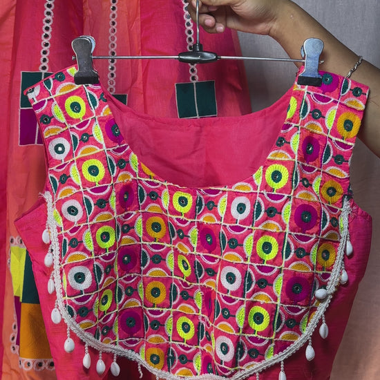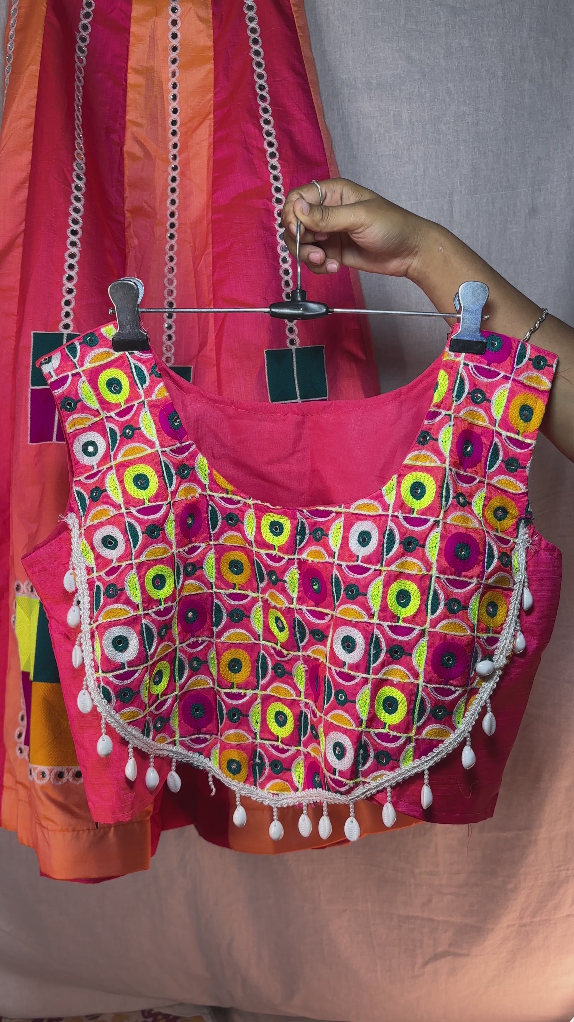 Lehenga (Skirt): Bright orange-pink base, flared design with multicolor patchwork squares.
